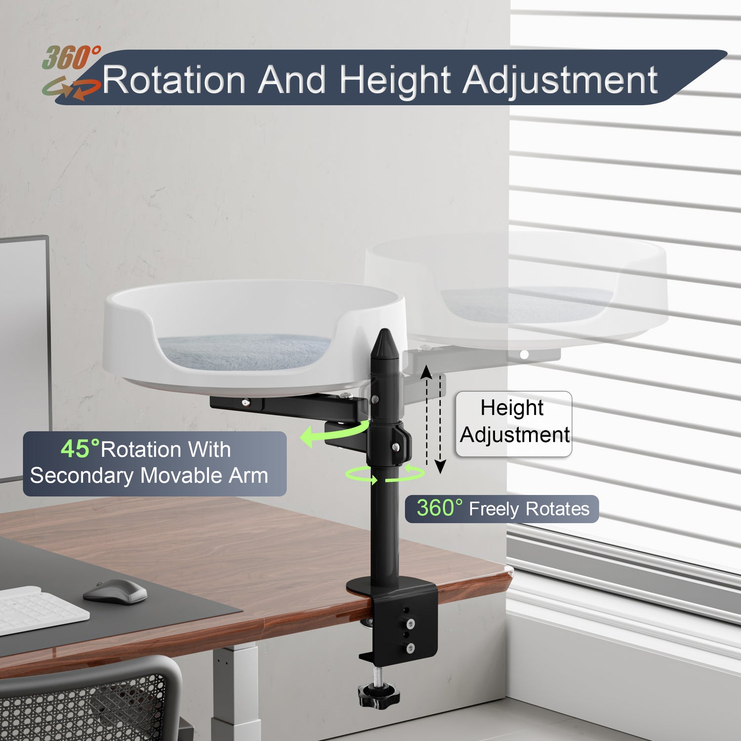 The cat bed offers complete adaptability to suit your space,featuring a bed that can spin a full 360° around the post and adjusts height vertically.Moreover,there is a secondary movable arm for 45° rotation.You can quickly adjust the angle and distance between you and your cat
